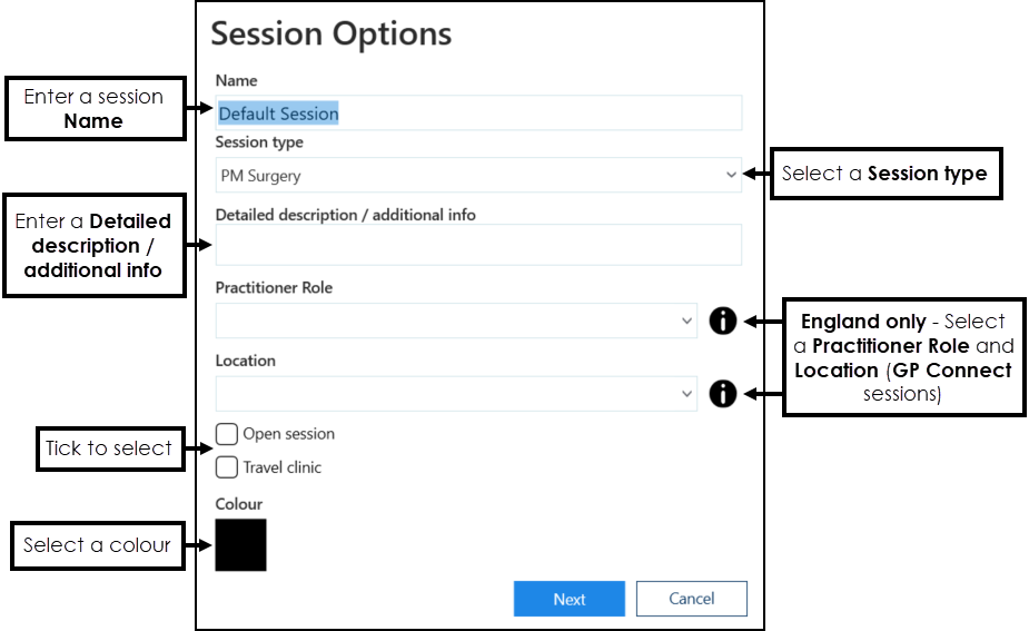 - Name - Enter an appropriate session name, for example 'GPs AM', 'Dr Smith AM', 'Nurses PM surgery', 'Ante-Natal Clinic'. This name displays when listing available sessions and on the Reception View so should be appropriate, a maximum of 30 characters.
