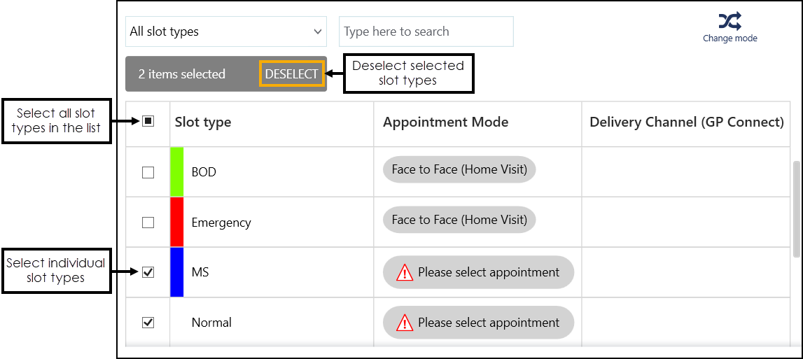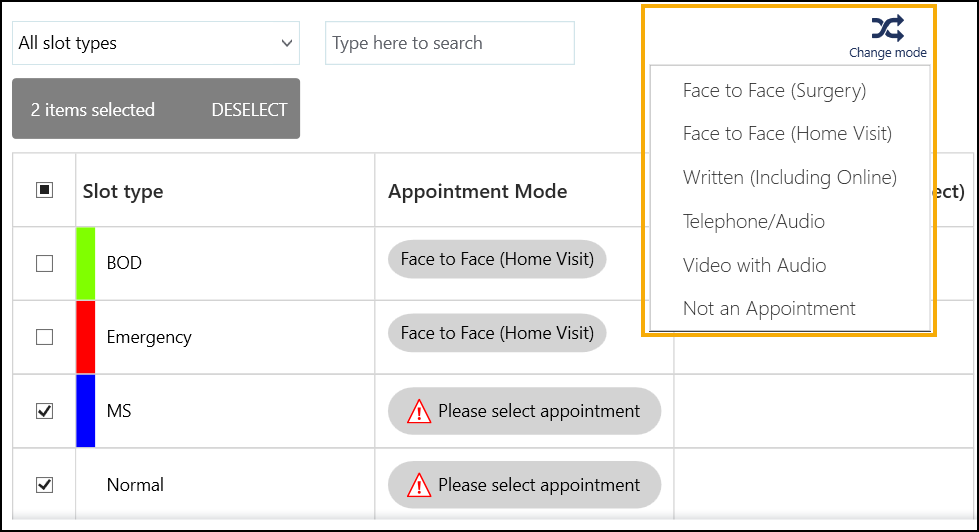 From Appointments Setup 3.5, you must map all slot types to one of the following appointment modes:
