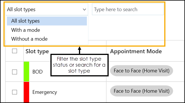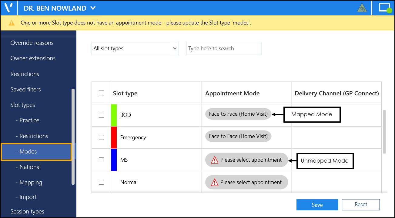 From the , select Slot Types - Modes to display all slot types and the mapped appointment modes.