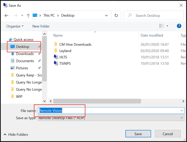 5. Navigate to your Desktop and in File name enter Remote Vision.