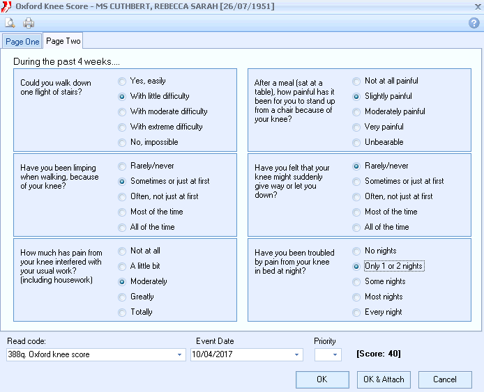 - On completion of the questionnaire you can save it to the patient's record by selecting OK and Attach. The Read code 388q00 - Oxford knee score is recorded in the Scoring Test Results structured data area.