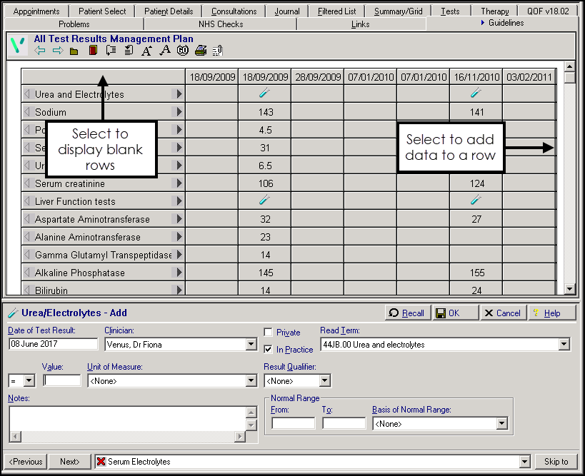 If you right click on a pathology or X-ray heading on the of a patient record and select Management Plan, you can view test results within Management Plans. Categories include: