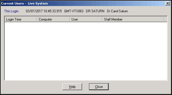 The Current Users screen displays, showing a list of current users, where and when they logged on:
