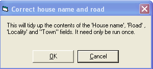 If conversion to Vision 3 has mixed up, say, the house name in Road, and the road in Locality, you can alter this by selecting Correct House Name and Road from Addresses. It only needs to be run once.