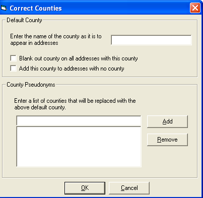 - Type in each pseudonym in the window Enter a list of counties that will be replaced with the above default county. Then click on Add. (You can highlight a pseudonym and click on Remove to delete one).