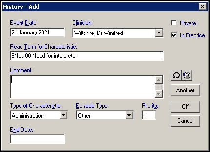 - Read Term for Characteristic - Defaults to 9NU..00 Need for interpreter, but can be updated as required. See the Consultation Manager Help Centre for details on selecting clinical terms.