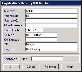 - Select the patient concerned and the Registration - Security NHS/CHI/H+C Number screen displays: