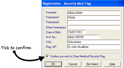 - Tick Confirm you wish to Clear Medical Record Flag and select OK.