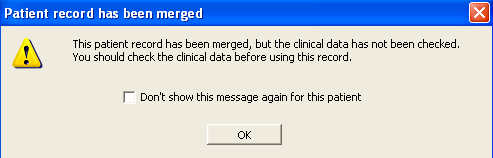 - After the merge has completed and you have opted to view the merged patient record, the following message displays: 'This patient record has been merged, but the clinical data has not been checked. You should check the clinical data before using this record.'