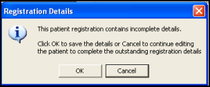Before finally saving a newly added patient's details, see New Patient Check List, you are reminded if you have not fully entered the details necessary to make this registration complete. There are two types of Incomplete Registration Warning messages: