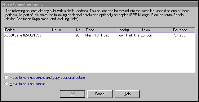 • Move to new household - To move the new patient in with one of the patients displayed, highlight the patient required and select Move to new household.