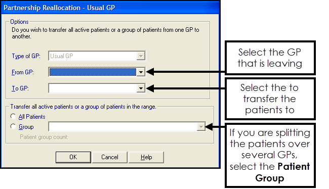 You can transfer patients, either all, or those within a group, from one usual GP to another. The Acceptance date does not change.