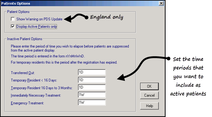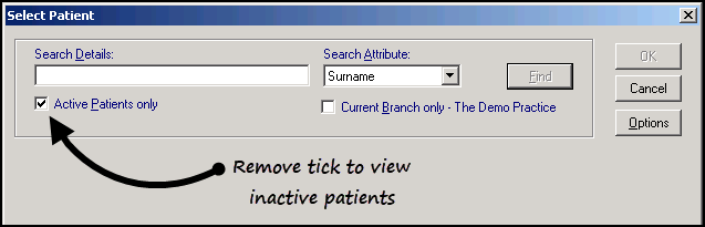 Options enables you to view additional patients on the active patients list. Tick Active Patients Only to enable Options.