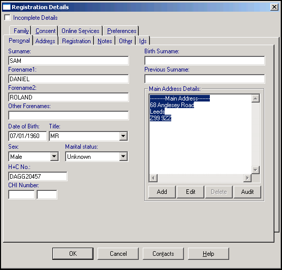 Enter the number without spaces on the Registration Details - Personal tab in H+C No. It is important that you do not enter CHI numbers in the H+C section.