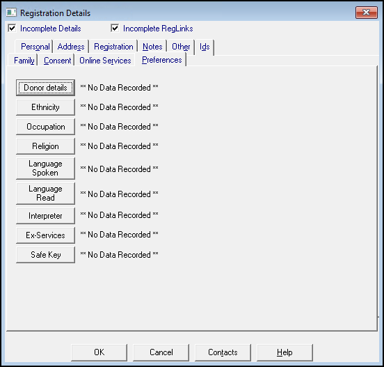 Once recorded the latest entry displays in Registration Details - Preferences, and an entry is added to the patient's clinical record with a consultation type of Administration and the appropriate clinical term.