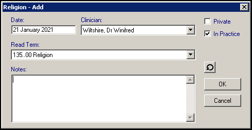 • Clinician - If the data is recorded by a member of staff the Clinician defaults to Usual GP. If the person recording the data is set up with a Clinical role, their details are shown.