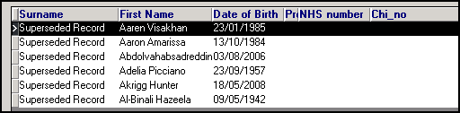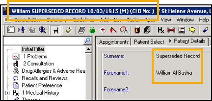 In Consultation Manager, a superseded patient name displays as 'First Name Surname Superseded Record', with a date of birth but no CHI number: