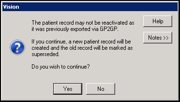 is recorded in the patient record, a message displays advising you 'The patient record may not be reactivated as it was previously exported via GP2GP. If you continue, a new patient record will be created and the old record will be marked as superseded.':