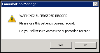 If you try to access a superseded record anywhere is Vision 3, a 'WARNING! SUPERSEDED RECORD! Please use this patient's current record. Do you still wish to access the superseded record?' message displays:
