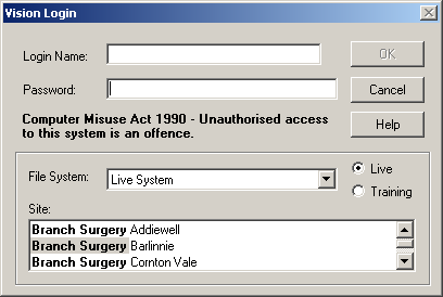 The following steps detail how to logon to Vision. Please ensure that you have selected the correct establishment from the site option before entering your login name and password.