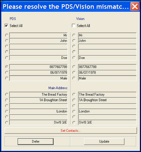 - Update - If you select Update, the changes are made to the field selected by the radio button, either under Vision 3 or PDS. (note you cannot select update if the Set Contact button is red (denoting a discrepancy) and has not been reviewed.