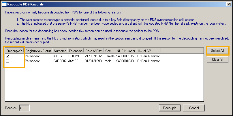 - Tick the Recouple next to the patient you wish to recouple. To select them all, select Select All.
