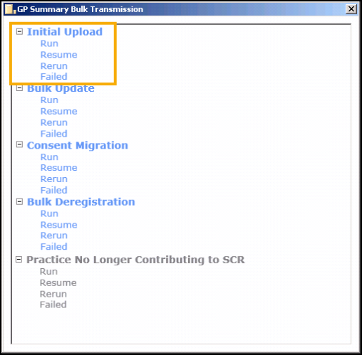 - Run - This action sends a GP Summary Initial Upload for all eligible patients. This should only be run at a time and date agreed.