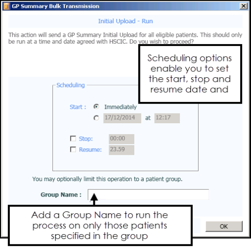 - To start the process immediately, select OK, or set an alternate start, stop or resume time, adding the required details, see Scheduling Options for details.Note - For both manual and scheduled uploads, your Smartcard should be left in the reader until your upload has completed, however, it should be noted that your Smartcard automatically expires after 10 hours and in line with Information Governance, you must not leave your Smartcard unattended in the reader.
