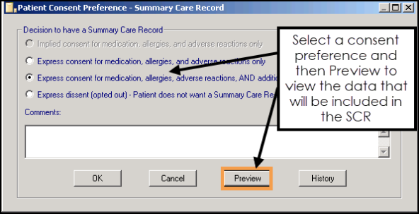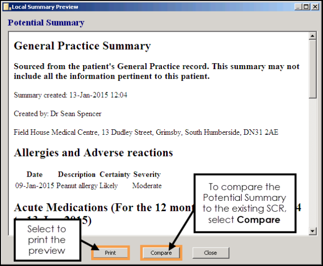 When changing a patients consent preference you can preview the data that would be included in the Summary Care Record based on the consent selected. You have the option to compare the preview to the Current Summary Record and if required the preview can be printed.