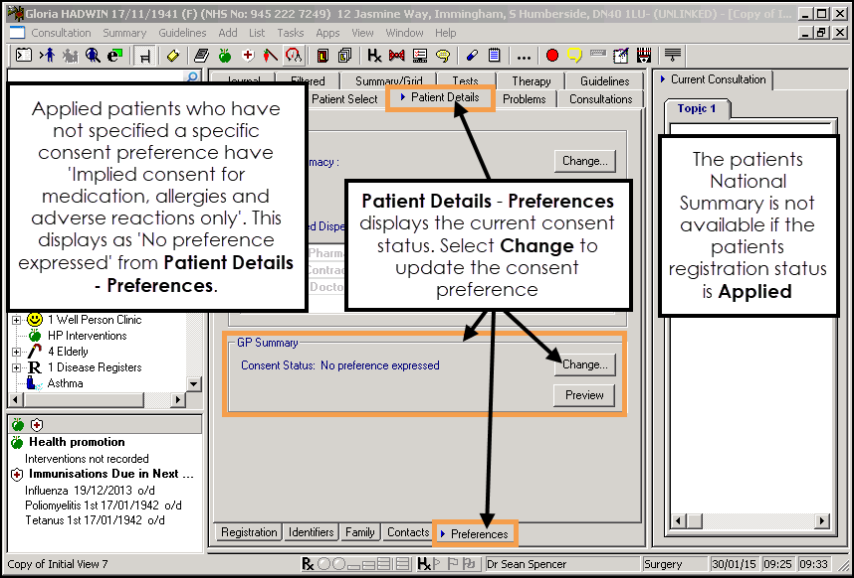 Whilst the patient is "Applied" their consent status can be updated, however, this is not sent to the Spine until the patient's record is next selected once they are "Permanent". If no consent preference is recorded for the patient implied consentis assumed, it displays as "No Preference Expressed" in Consultation Manager. When permanent the patient's SCR contains core data only.