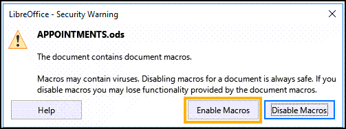 5. If a Security Warning displays, select Enable Macros to continue running the LibreOffice Calc Extract process. If no warning displays, the LibreOffice Calc Extract opens automatically: