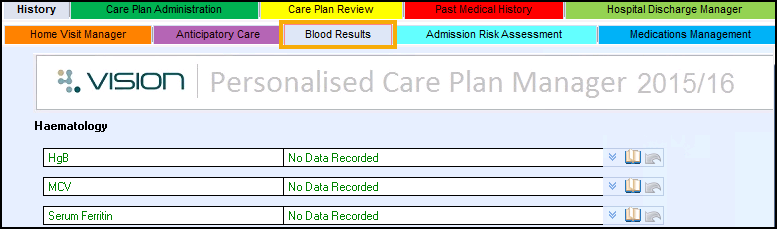 The Blood Results tab is pre-populated with the patient's latest blood results and is categorised to help clinicians manage the patient's care. To view previous results click the Previous entries