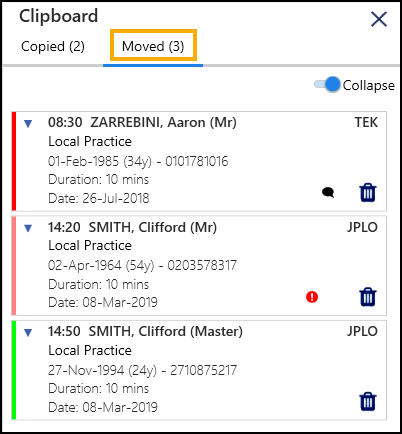 your moved appointments display on the Moved tab.Training Tip - If you log out at this point the moved appointments remains on the Clipboard. - Find the appointment slot required and then drag and drop the moved appointments from the Clipboard to the new slot. All the associated comments automatically move to the new date and time.
