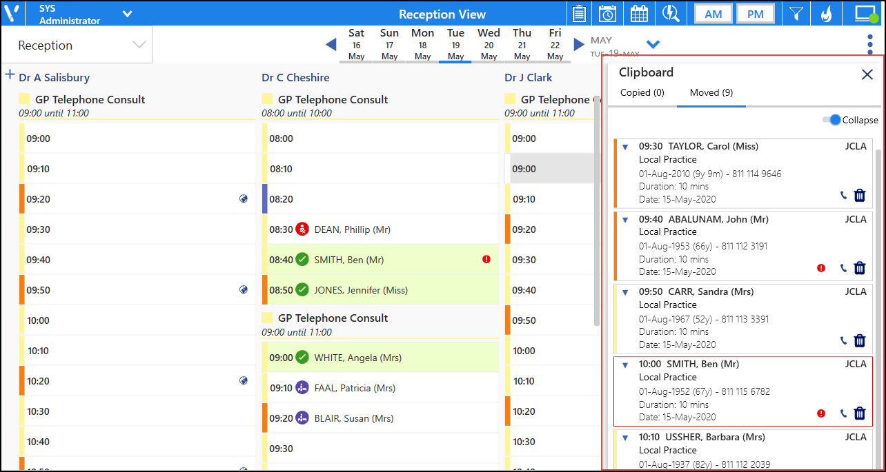 - Drag and drop an appointment from the clipboard to an available slot to schedule or reschedule it.