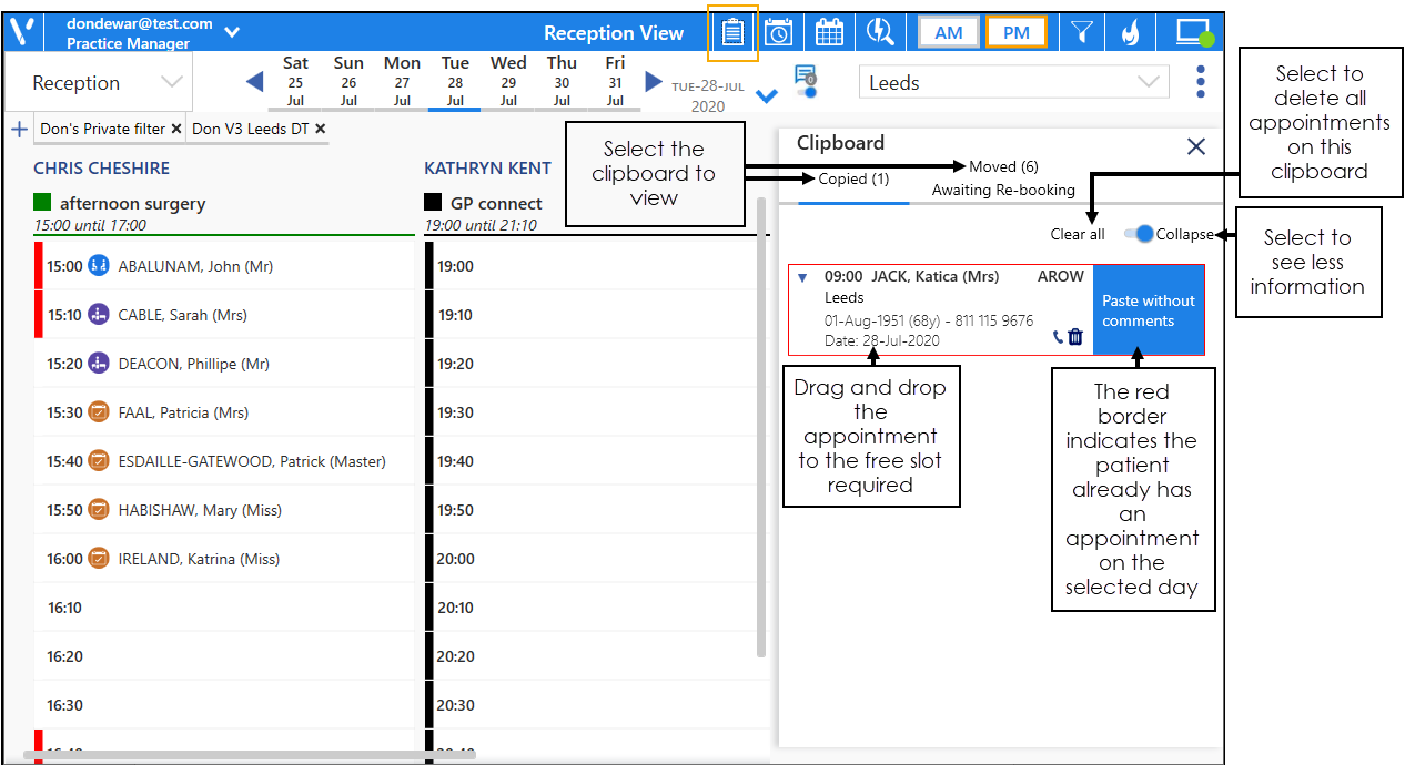 The Reception View includes a clipboard for quickly rescheduling or copying appointments: