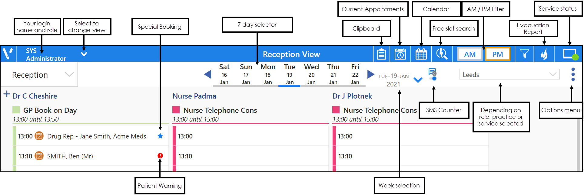 The view displays the clinics and clinician sessions side by side, to show all appointments at a glance: