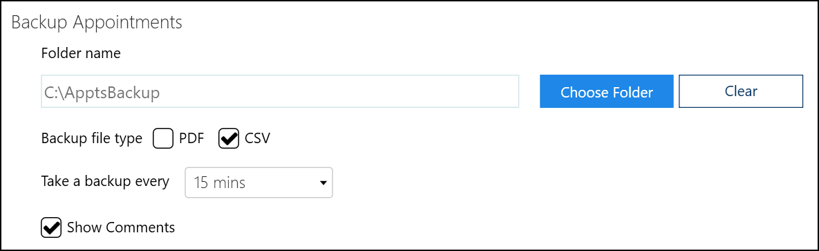 Folder name - Set the backup folder location (either local or mapped/shared drive), select Choose Folder to locate the folder or Clear to clear the current location.