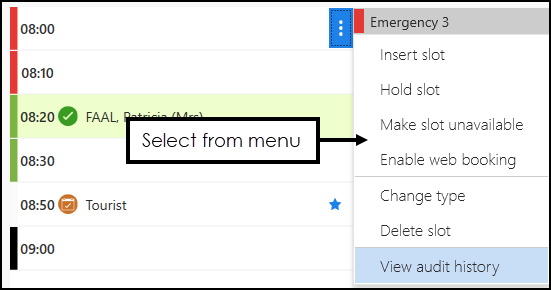 There are various options available to you when using the Reception View. These options vary depending on how they are accessed and the status of the slot selected: