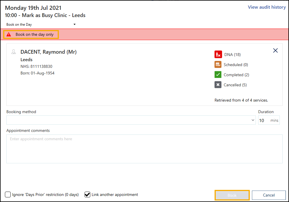 If you select a slot with a 'Days Prior' restriction, a warning displays and Book is not available: