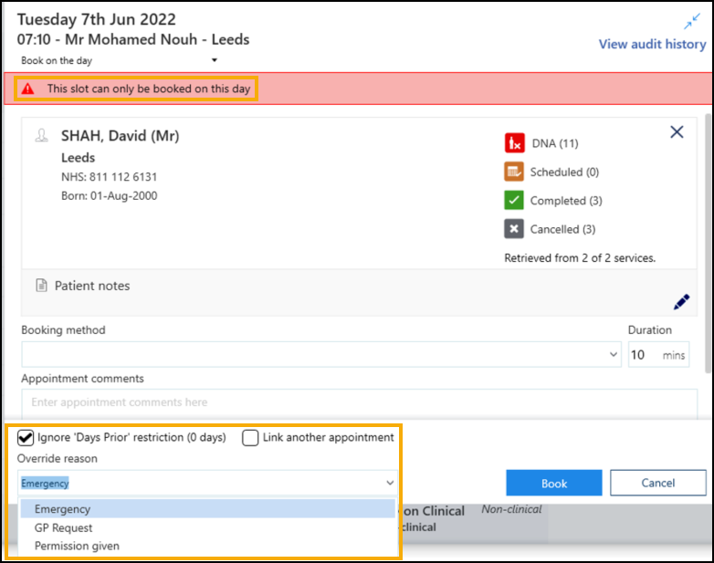 If Enforce days/hours prior restrictions is not set in Preferences - General and you tick Ignore 'Days Prior' restriction on the booking form to book the slot, you must enter an Override Reason to record why you booked an appointment in a slot with a Days/Hours Prior restriction.