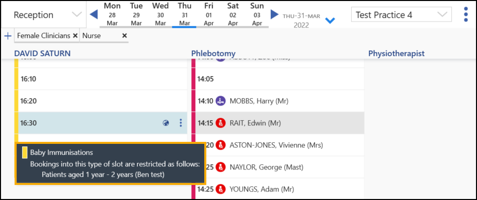 From the Reception and Free slot search views, if you hover your cursor over an appointment slot the Slot Type Restriction information displays in a tooltip: