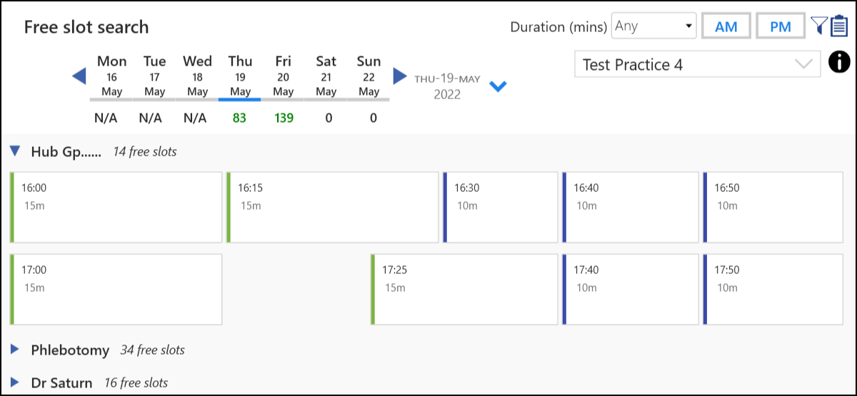 : - The Free slot search screen displays available appointments, maintaining any existing filters set up in the appointment view. Depending on your selection in Preferences - Display Options, the search results display in either of these styles: