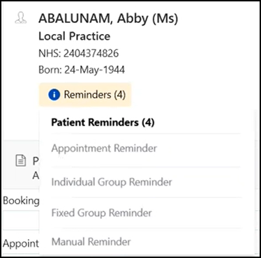 When a patient has a Patient Warning or Patient Reminder (also known as Yellow Reminders) set in Consultation Manager, an alert displays in various areas of Appointments.