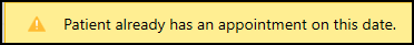If your patient already has an existing appointment on the same day the message 'Patient already has an appointment on this date' displays.