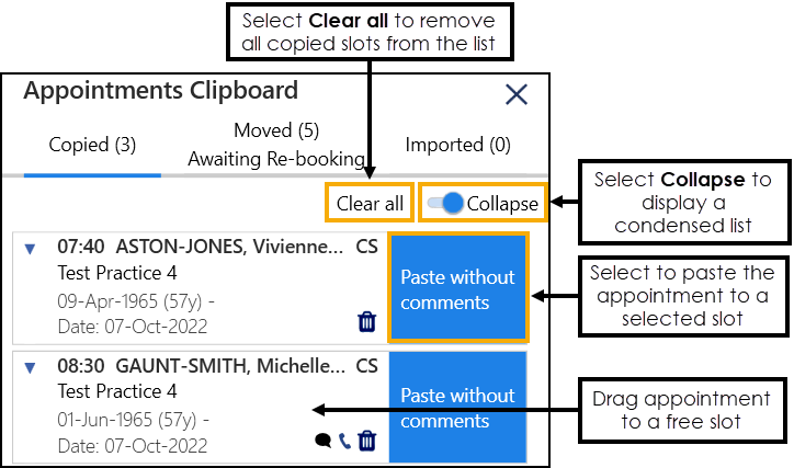 - Drag and drop the copied appointment into the slot required, or highlight the required slot and select Paste without comments.