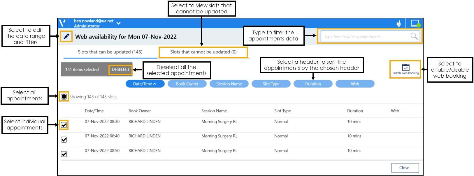 Sort - Select a column header to sort the appointments by the chosen header, for example select Session Name to sort the appointments by the session type. You can sort ascending or descending as required.