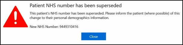 Superseded NHS Number - A warning message displays when performing a National Patient Search and returning a patient with a superseded NHS number: