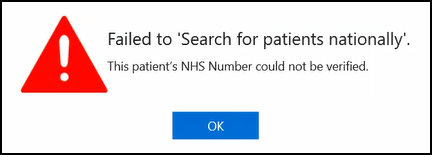 Unverified NHS Number - A warning message displays when performing a National Patient Search and the patient's NHS number cannot be verified: