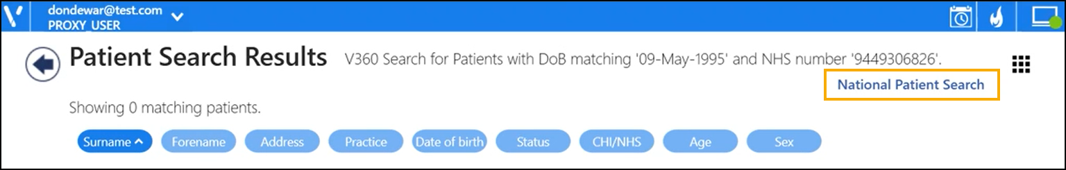 Note - The initial search finds patients from EMIS and Vision practices that are within your federation and already on your database. Previously found SystmOne (TPP) patients also display, however the information may not be current. It is advisable to search for them again using the National Patient Search to find the current information. -