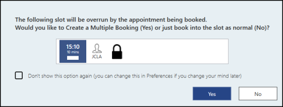When making an appointment and the duration has been extended, the option displays to bulk multiple slots which prevents the following slot(s) over running.